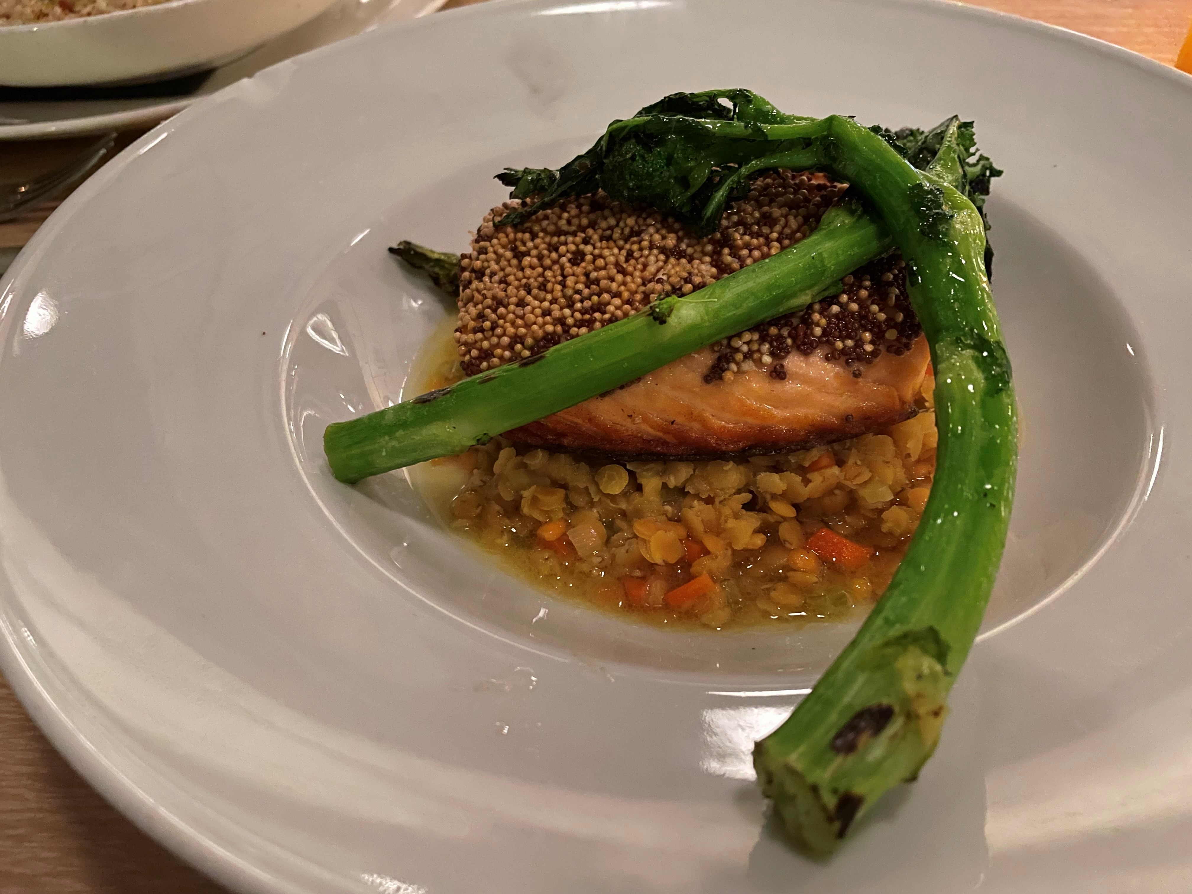 Dinner had arrived right after I sat back down in my seat, I would say it took a little longer then some people may like but we figure if they are cooking something from scratch like risotto it takes some time. My husband had the carbonara risotto, a combination of things he had been very into lately. I had the mustard seed crusted Scottish salmon over lentils which our server had mentioned was a great choice. We dug in and gave the food a chance to surprise us, I think though we were simply surprised that is wasn’t amazing.
