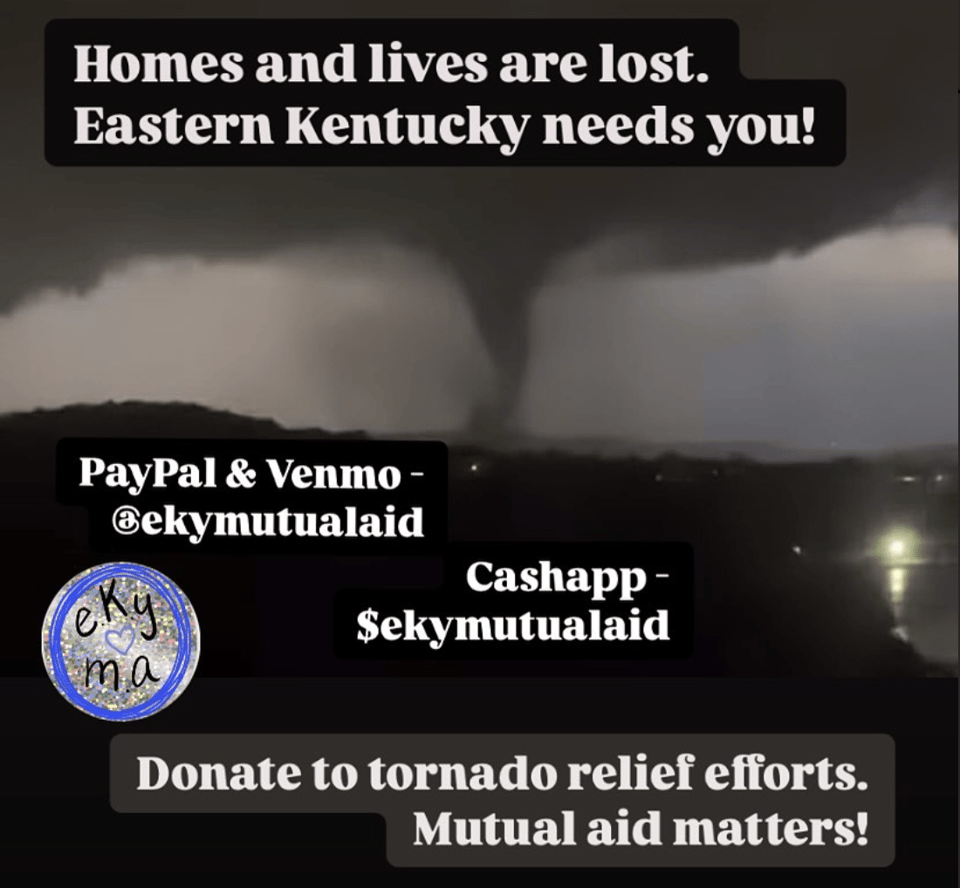 My beloved east Kentucky was recently hit again by climate disaster, this time devastating tornadoes. Please consider giving to EKY Mutual Aid to help those impacted.