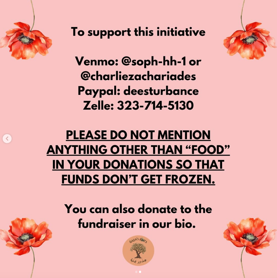 via @gazasroots I recently redistributed money to Gaza’s Roots’ Gaza Food Program. You can find out more about their work on Instagram @gazasroots, and also via their Chuffed page.