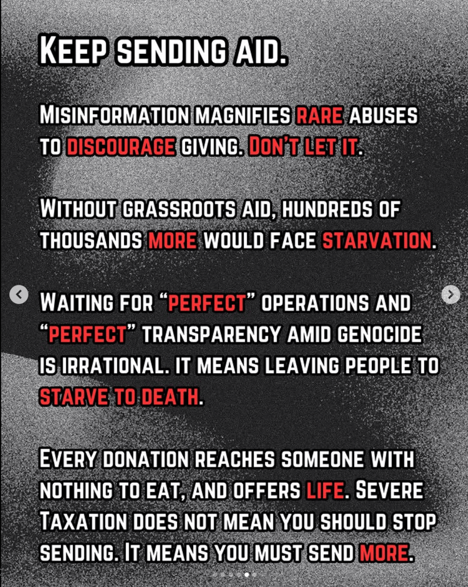 This thread on Instagram was helpful for me in understanding how best to provide financial support right now to Palestinians trying to survive the genocide.