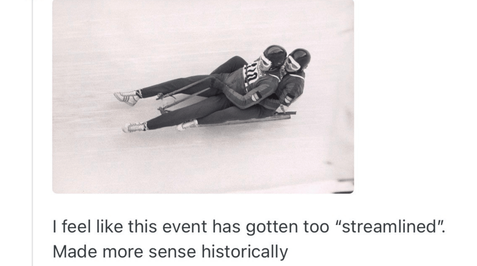 Oh, and I think I have a theory as to how doubles luge came about. In its current form, two people race down the track on a sled, feet-first, lying flat on their backs, literally one stacked on top of the other. Here’s what it looks like.