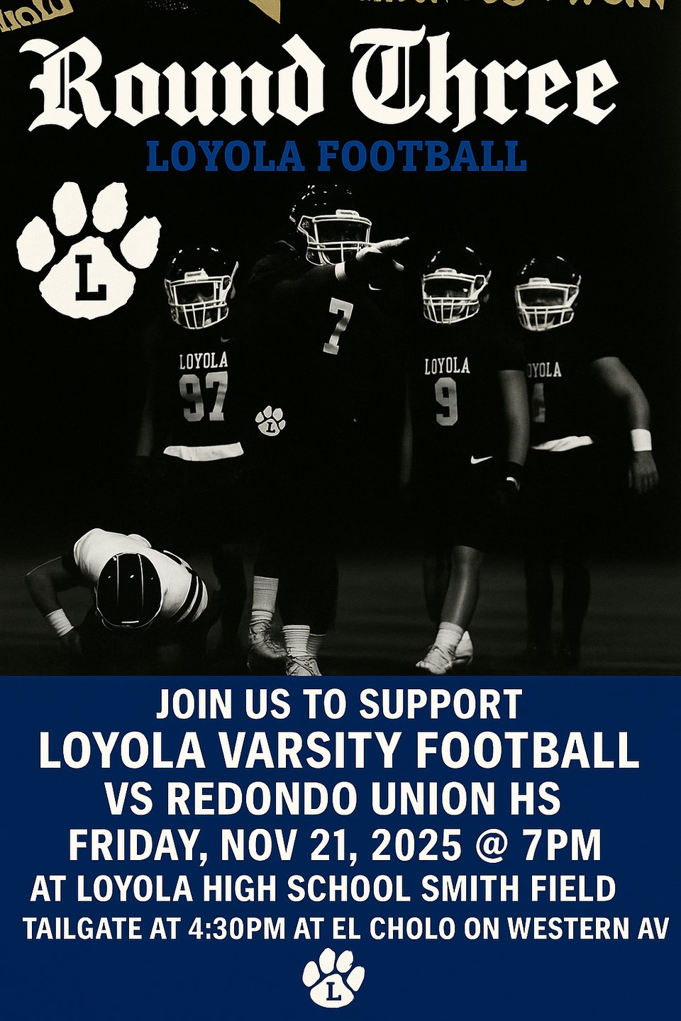 This Friday (Nov. 21, 7PM), Loyola will HOST Redondo Union on Smith Field with a trip to the CIF Championship on the line. This is the biggest home game of the year — and we need every voice, every student, every alum, every fan.