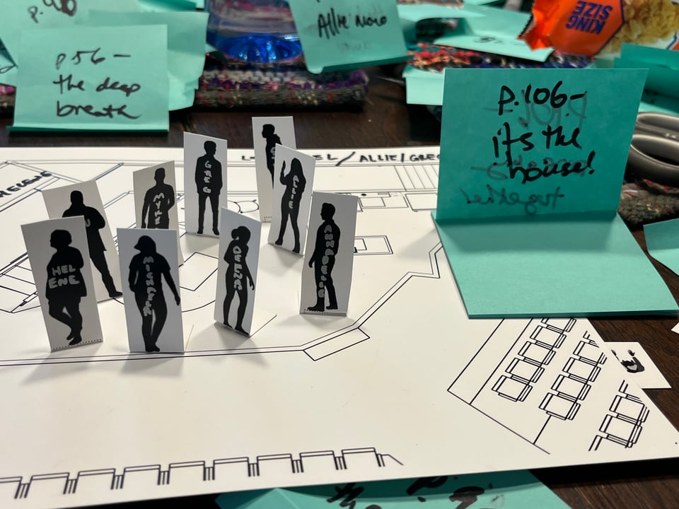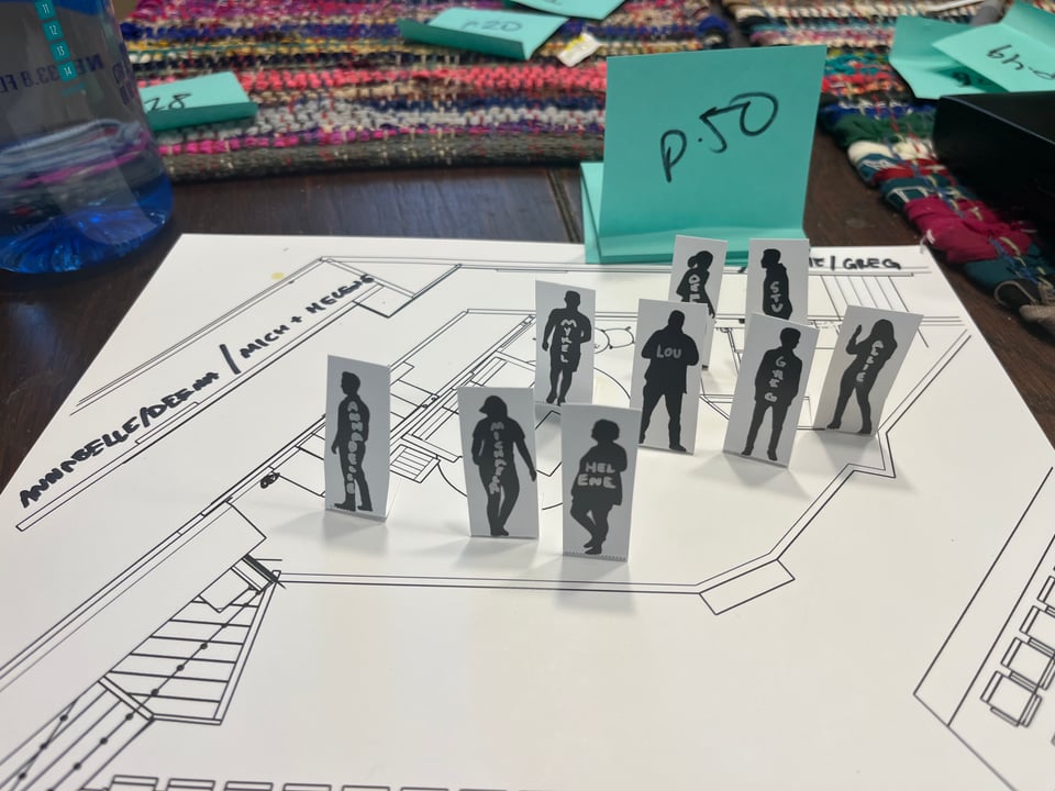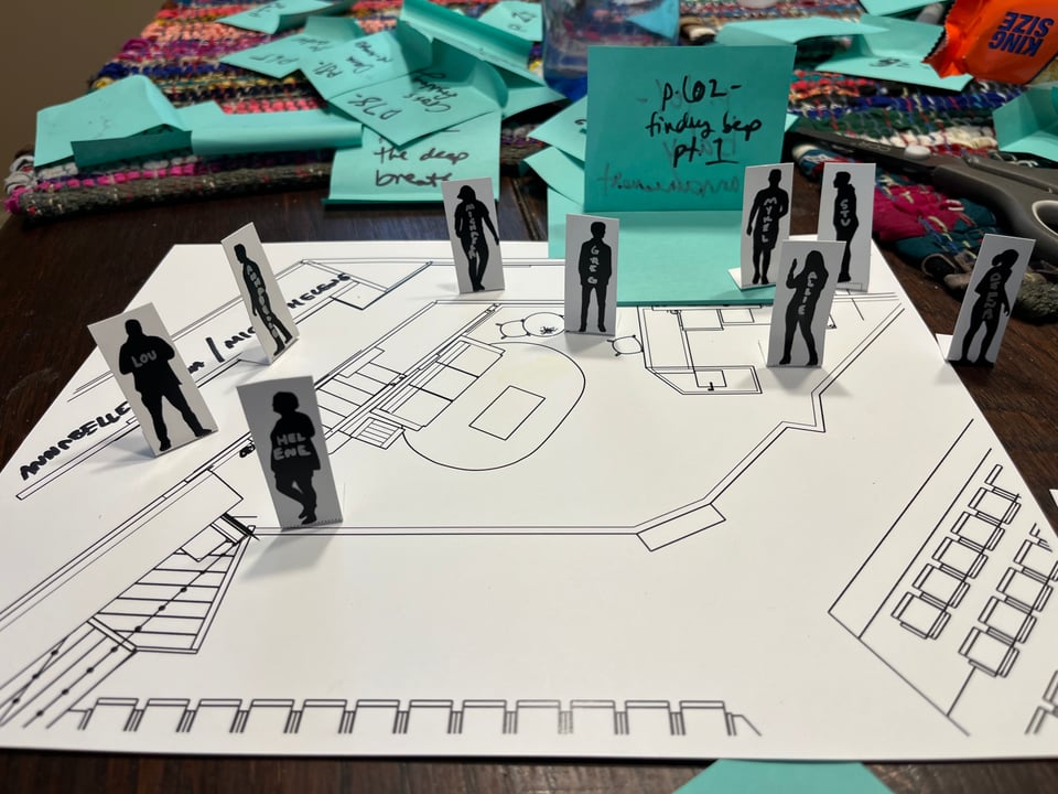 I wanted to let you in on my process—something I’ll be doing weekly to the backers of the Kickstarter if you donate. For shows like Mamma Mia! But Different and Moon Goon shows, it’s a mad dash to get everyone on the same page. There’s some similarities here, but we also get the luxury of diving into stuff and working out moments. However, because schedules are crazy, I have very few moments with everyone together, the goal was simple: block as fast as possible then run over and over until it feels good. In order to do that, I used a printout of the set and some tiny paper figurines (made for me by our wonderful designer KC McGeorge) and I blocked everything in my dining room with photo references. They came out like this: