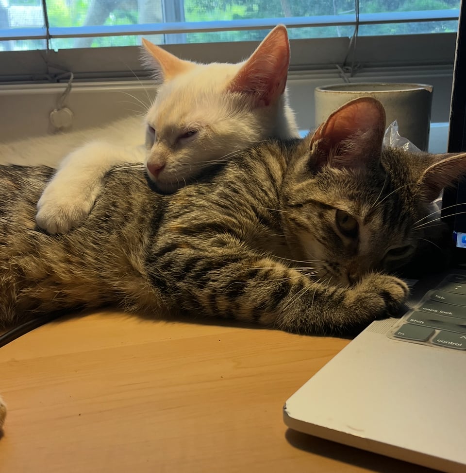 I gave them those names because I like imagining they’re two women that work in the front of a high school. They’re 6 months old and they’re forcing me to be chill, because there’s nothing like a purring cat sitting on top of you that makes you want to stay as frozen as possible.