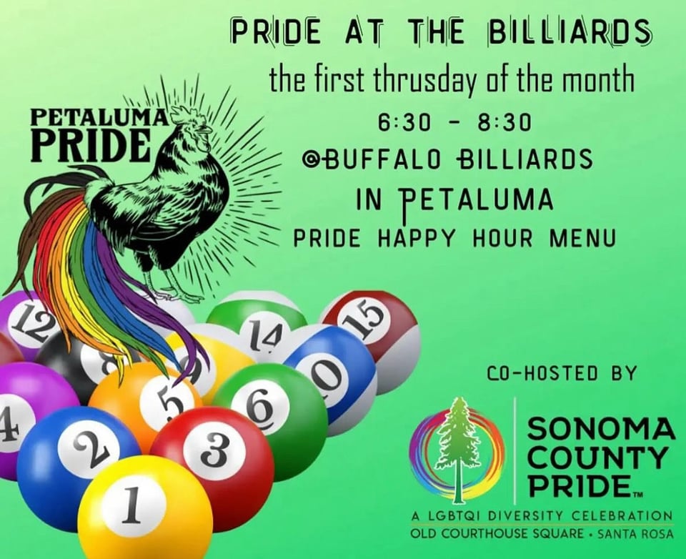 Thursday, June 5th – Petaluma Pride Happy Hour @ Buffalo Billiards from 6:30 to 8:30pm
