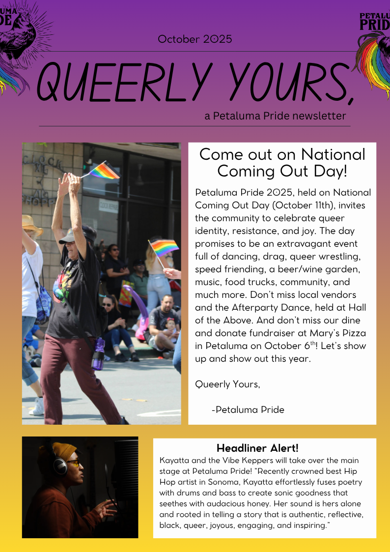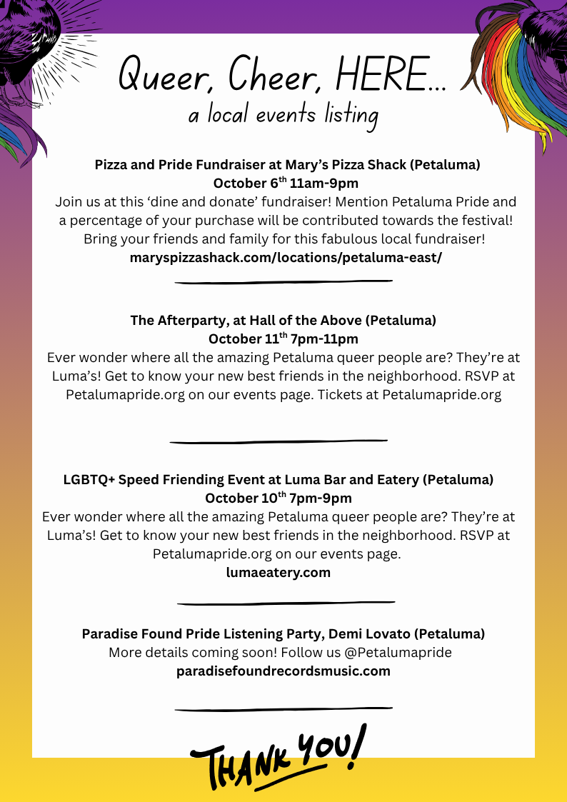 October 1, 2025 Petaluma Pride, 2025! See you at the Fairgrounds on October 11th! + Don't miss what's next. Subscribe to Petaluma Pride: Subscribe