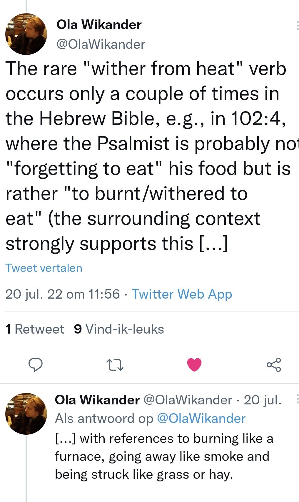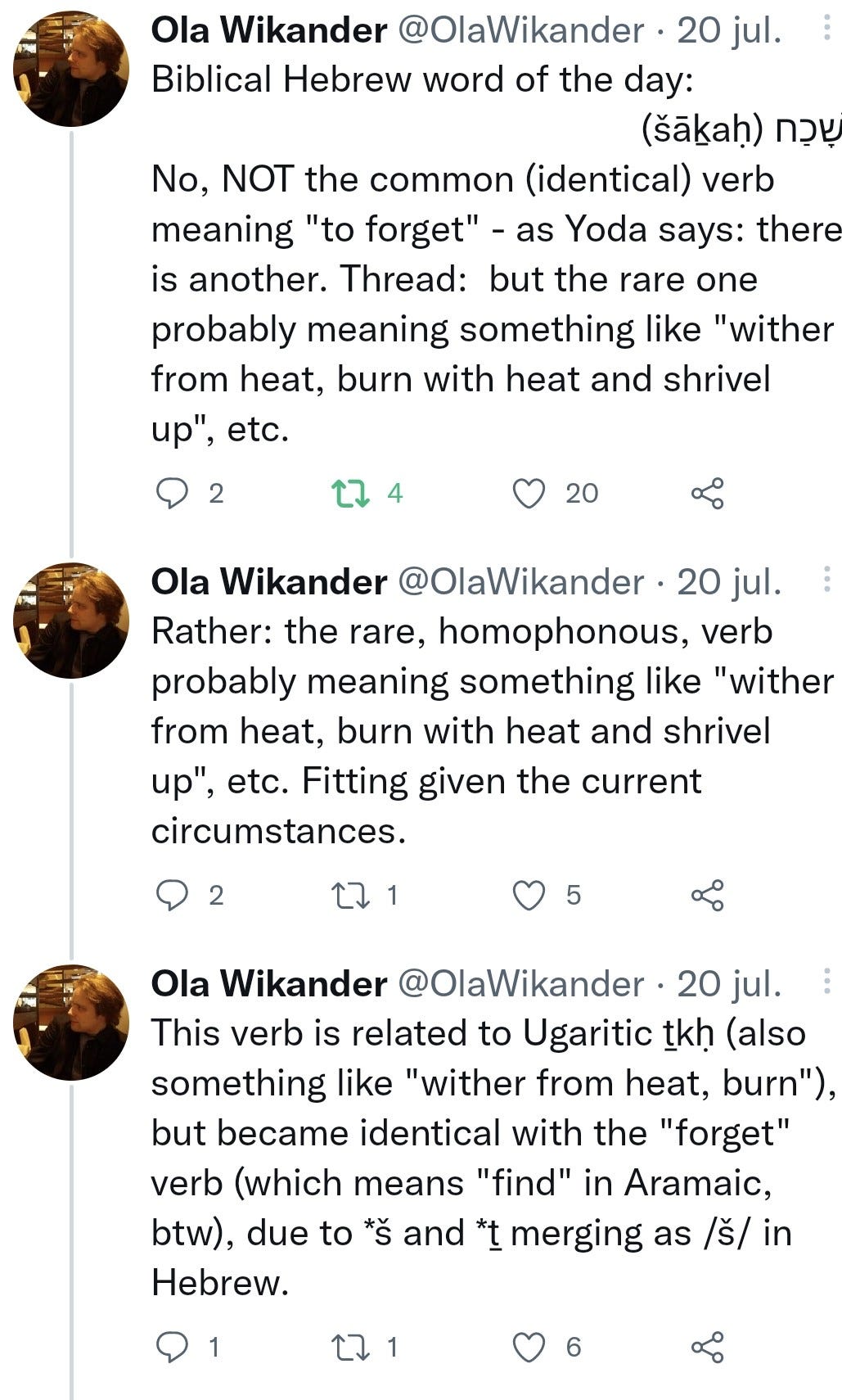 A week or so ago, a thread by the semitist Ola Wikander caught my attention. In this short series of tweets, he made the case of how a rather common Hebrew verb, שָׁכַח šāḵaḥ, may, in fact not be used to mean ‘to forget,’ as that word usually does, in the fifth verse of Psalm 102. He makes the case for interpreting the verb as ‘to be withered’ or ‘to be shrivelled up from heat’ instead, which would, in my opinion, merit a new translation1 of the verse. The main argument which he adduces at the level of the verse’s context is that the surrounding verses also evoke the idea of a poor man suffering under inclement, extreme heat. It is furthermore relevant that he points out the existence of a verb in Ugaritic which, given its form and meaning, can reasonably be proposed as the cognate of the verb שָׁכַח šāḵaḥ with the meaning Ola Wikander himself believes to be applicable here.2 The pertinent tweets are presented to you right below this paragraph.3
