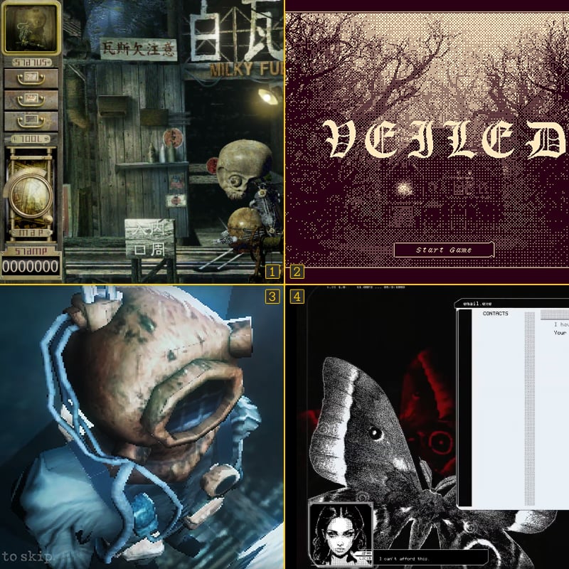 2️⃣ INDIE • Horror Adventure — In 2020, Rémi Bismuth and Nicolas Millot made a short horror adventure inspired by a fictitious Famicom game cover (shoutout to the annual Famicase exhibition!). In ►Veiled you explore an abandoned mansion infested with Lovecraftian monsters in stylish 1-bit graphics. (via indiebratgirl on Twitter)