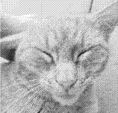◾ Too much work and no play makes Phil a dull boy. At least I got some work in my GameBoy tile generator done, although it’s nothing ready for public release at this time. So here’s an image of the neighbors’ cat I dithered with my tool-in-progress: