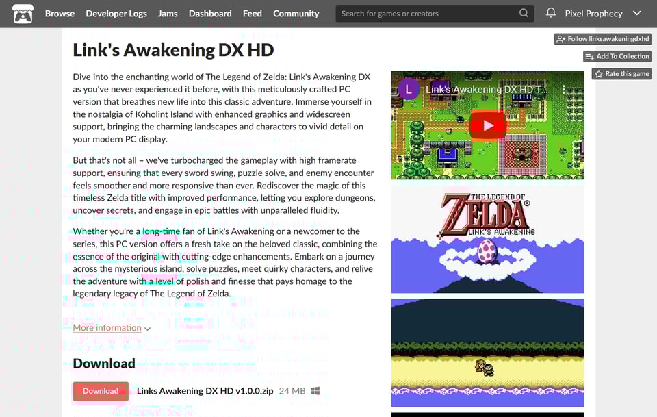 RETRO • Link’s Awakening on the PC! — Another cease-and-desist-pending release hit itch.io last week in the form of ►Link’s Awakening DX HD, a PC remake of arguably the best GameBoy game. Too good to be true? Perhaps, because I can’t help feeling that the copy has a ChatGPT smell to it. Also, itch.io issued a warning when I tried download the ZIP archive. Then again, the download includes source.7z