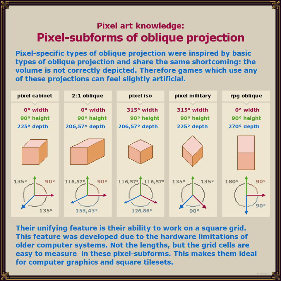 PIXEL ART • "Isometric games don’t exist!" — Pixelartist virtuoso and outspoken pixel art evangelist, Thomas Feichtmeir (cyangmou) ►shared a downloadable collection of no less than 40 slides “teaching geometry with a focus on computer-graphics.” Among them Thomas demonstrates𝕏 different modes of perspective and projection and why there is no true isometric game.