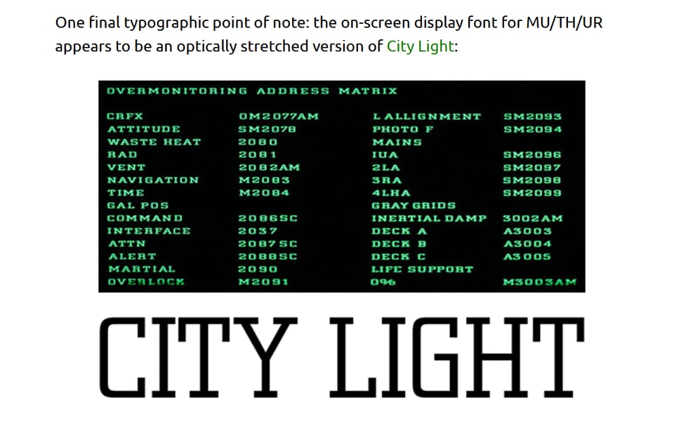SCI-FI TYPOGRAPHY • Alien Symbols — I must confess: I am one of the weirdos that enjoy spotting fonts. Even in the most riveting drama, I will point out that the sign behind the crying person on screen is set in Eurostile Extended Bold. If you are one of us, welcome, here’s your complimentary letraset sheet, have a seat, and let me introduce you Dave Addey’s ►Typeset in the Future, a blog about “typography and design in science fiction movies”.