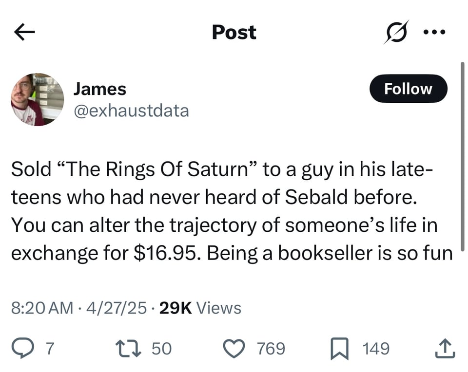 When I picked up Rings at a Waterstones in Cork last Christmas, I had known nothing about Sebald. The cashier, who had long hair and a skater vibe, quipped “A classic!” as he bagged it, which I noted in my mental TBR. Since then, I’ve had the gratifying experience of learning of Sebald’s role in the work of many of my other favorite writers.