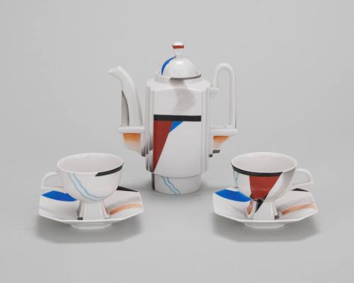 Photos show a fetching tea service crafted by Nalya Petrova, the head artist at Russia’s Imperial Porcelain Factory. Looking at it gives me the feeling of looking at some kind of rail train, locomotive etc. It has an industrious character.