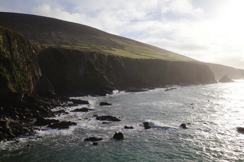 When we woke late the next morning, New Year’s Day, the skies were bright blue over Dingle. We went on a drive along the coast. Light covered everything, the puddles, pastures and wide, endless sea. Out and out, it spread like syrup. As we turned one of the sharp corners into an open vista, with Ruairí humming softly at the wheel to some song, I thought to myself: I can’t believe this is my life.