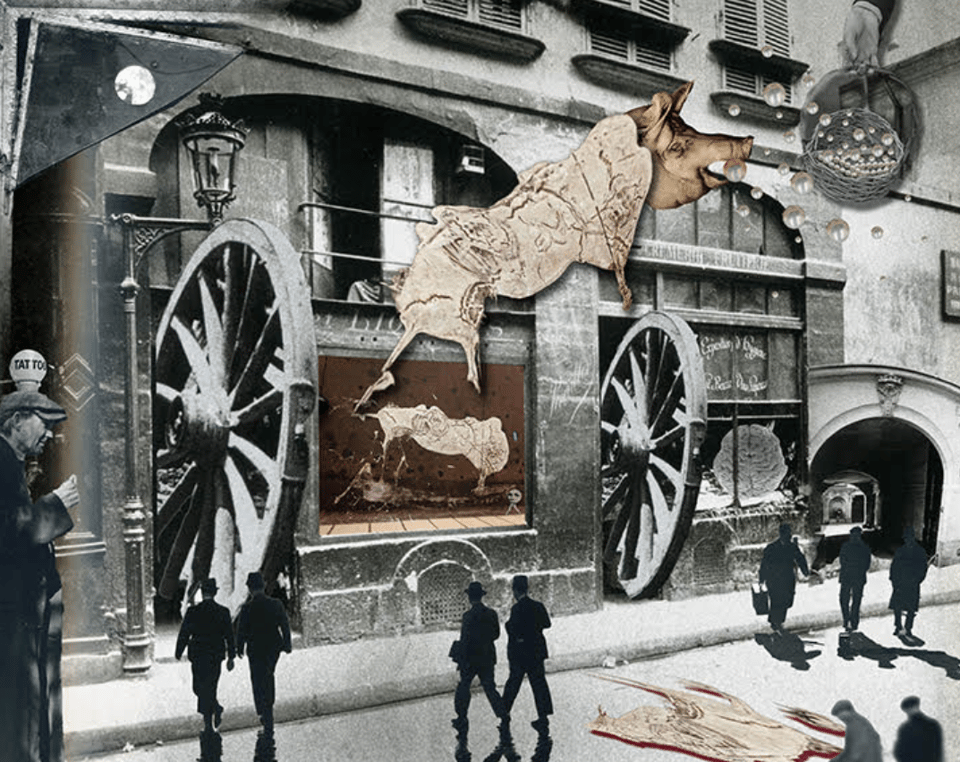 While I hammer away at the keyboard, my partner in life and art has been creating new and even more provocative original art. Here’s “Swine After Pearls (Business as Usual)”