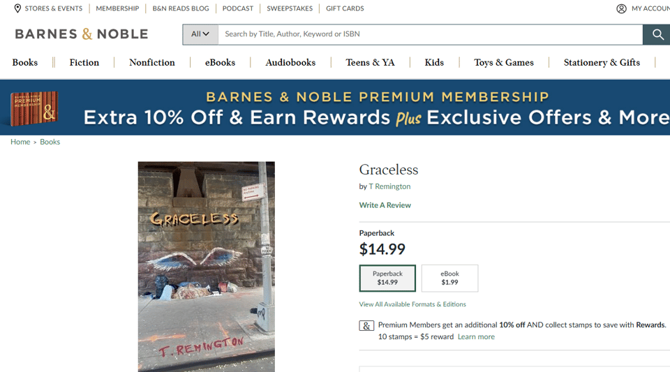 For everyone else, you can now order the paperback of “Graceless” on the Barnes & Noble website. I bought a copy of my own book just to see how it looks.