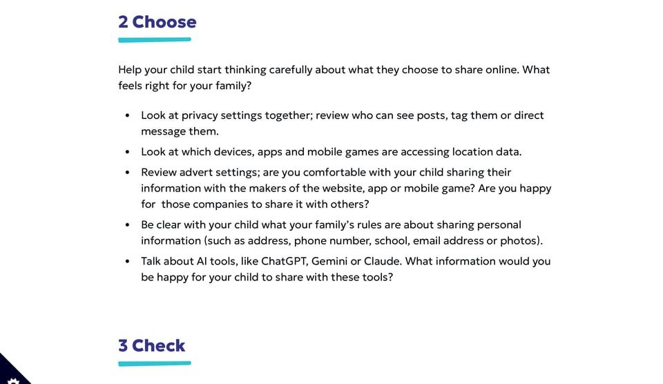 (Alt text :Help your child start thinking carefully about what they choose to share online. What feels right for your family?