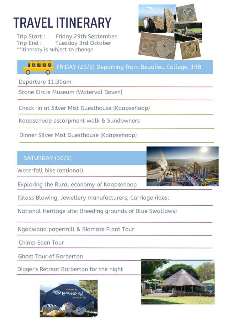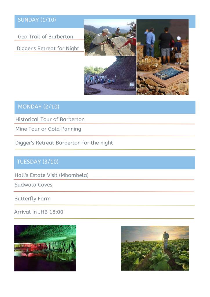 Option 1: Please note that we now leave on Friday (29th September) and return on Tuesday 3rd October 2023. The Conference is a day shorter and the new cost of the tour is R7000.