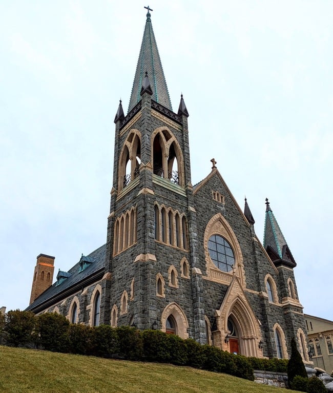 -- Yesterday, on the way back from appointments in Charlottesville, we stopped for a delicious dinner at Chicano Boy Taco in Staunton. (Tip: go for the pork belly taco and the Mexican street corn.) As we walked after dinner we were impressed with the number and size of beautiful church buildings in the old town. My picture below is of St. Francis of Assisi Catholic Church.