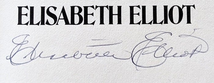 Photo below of Elisabeth Elliot’s autograph in Twelve Baskets of Crumbs, which she signed for us in July 1978. Unless otherwise indicated, all Scripture quotations are from The ESV Bible (The Holy Bible, English Standard Version), copyright 2001 by Crossway, a publishing ministry of Good News Publishers. Used by permission. All rights reserved.