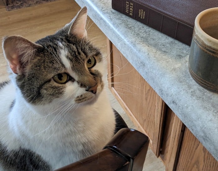 Image credit: drawing above, of Christ healing the leper, is by Rembrandt (1606--1669); photo below of our cat, who sometimes joins me for morning Bible reading. Unless otherwise indicated, all Scripture quotations are from The ESV Bible (The Holy Bible, English Standard Version), copyright 2001 by Crossway, a publishing ministry of Good News Publishers. Used by permission. All rights reserved.