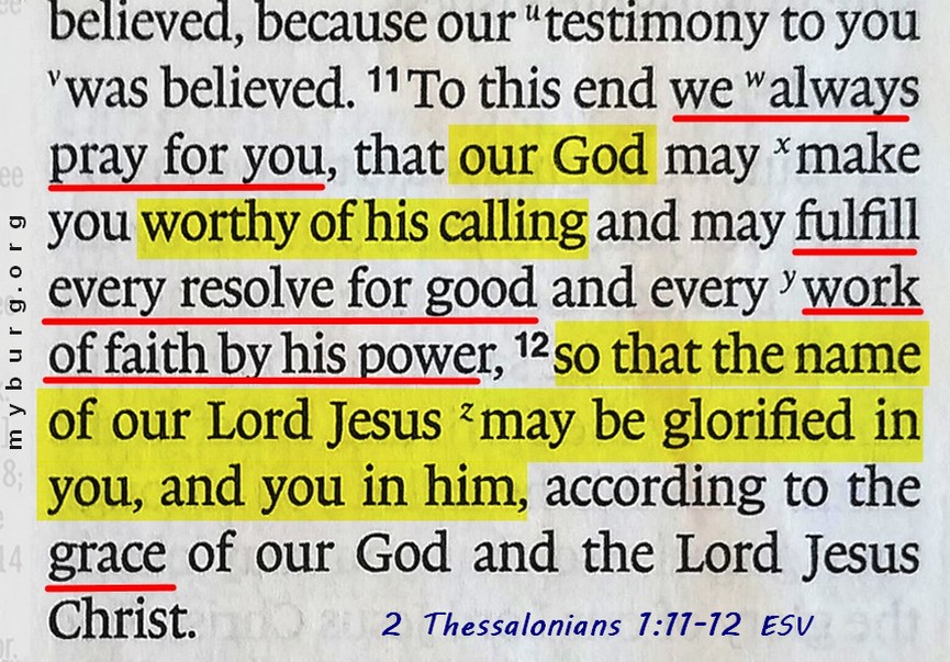 "To this end we always pray for you, that our God may make you worthy of his calling and may fulfill every resolve for good and every work of faith by his power, so that the name of our Lord Jesus may be glorified in you, and you in him, according to the grace of our God and the Lord Jesus Christ." (2 Thessalonians 1:11-12)