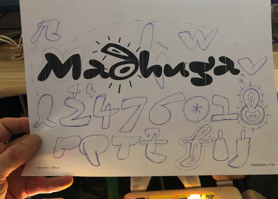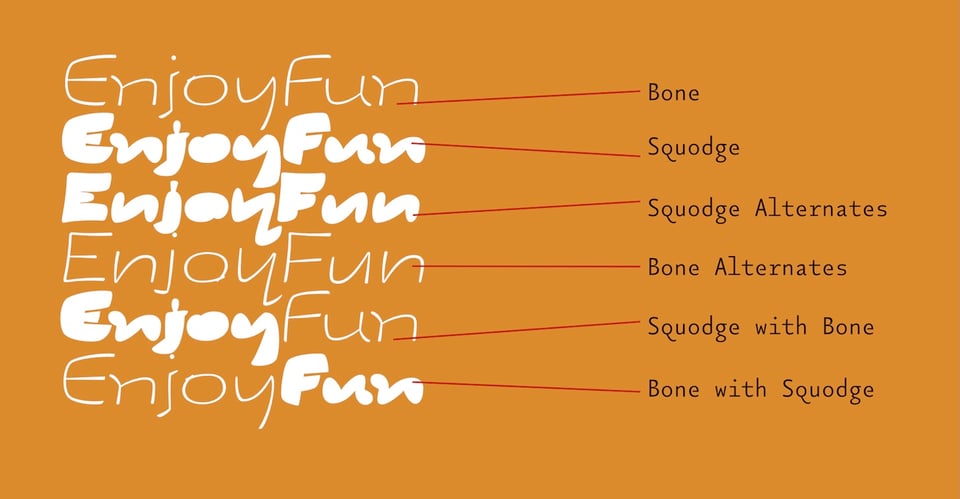 Now then: I have finally got off my arse* and am sending out the first Shapes for Cash Newsletter (something that I think we can all agree is a very special thing indeed). The reason for this sudden lapse into communicative mode is to announce the release of two lovely new typefaces, that will be the foundation for some others to come shortly ¶ These typefaces are called Squodge and Bone, and they form the core of an unorthodox family of designs named EnjoyFun (occasionally these words will be suffixed with ® and ™ symbols for, well, fun) ¶ Things started with a few sketches of what became the heavier of the two (Squodge), here are a couple of them: