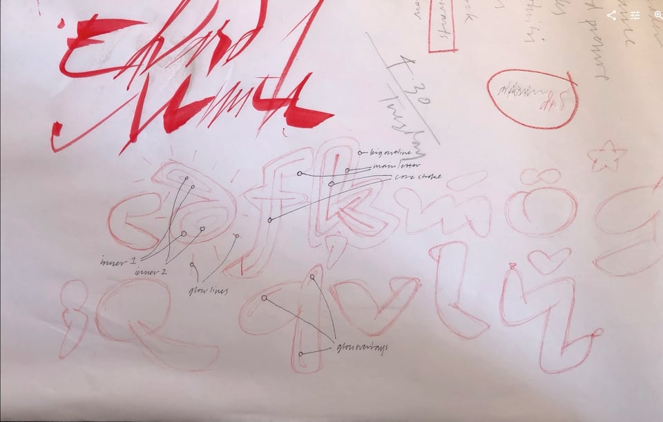 on Tuesday and seems to indicate that Edvard Munch was much on my mind at the time. Apart from a vestige of a chore list, there are some indications that I wanted to expand the design to have things going on within and without the lettershapes, how exciting!