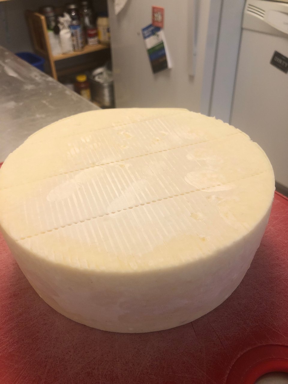 The Alpine-style cheese is significantly more of a departure for me. This four-pound cheese does not have salt added to the cooked curds at the time they go into the plastic form, instead being soaked in a brine solution for about a day after it’s been pressed. This should result in a sweeter, smoother cheese than a cheddar, which has the salt milled in with the curds before it goes into the press. This tomme will also have a washed rind, which is to say that I will be taking it out of its cooler to wipe the whole thing down with more brine every 3-5 days. This cheese should age for three to four months and end with a pliable paste with a mild nutty taste and a very stinky rind.
