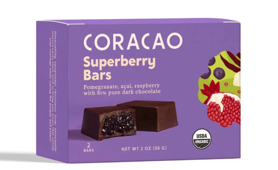 The Bay Area’s Coracao Chocolate is a favorite in our household where we always have about 97 varieties of chocolate on hand. Coracao is vegan but neither of us are. I’ve just found a single square of the Superberry Bars (which are like Chunky Bars with raspberry and acai jam inside) the perfect end to pretty much any meal. A box has 4 such squares and prices at $7.50.
