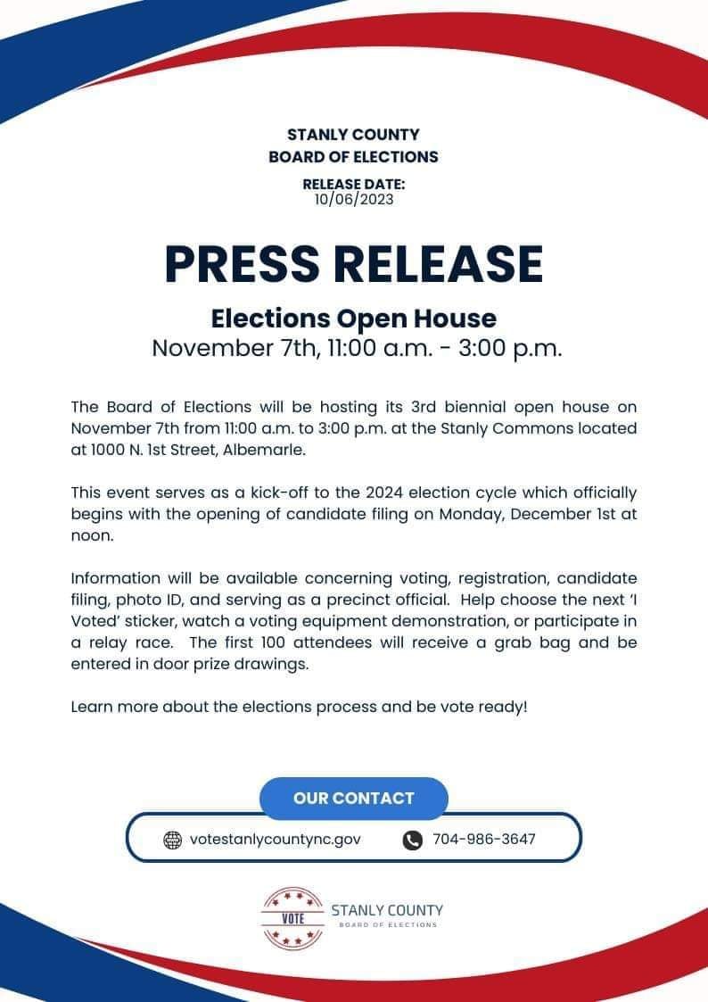 The Stanly County Board of Elections will host its 3rd biennial open house on November 7th from 11:00 a.m. to 3:00 p.m. at the Stanly Commons located at 1000 North 1st Street in Albemarle.