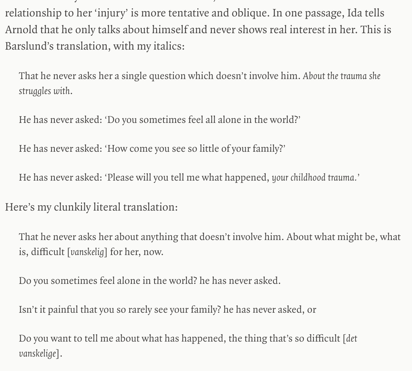 “In her English version of If Only, Barslund, a translator I usually admire, tends to sacrifice conceptual accuracy to colloquial fluency. The effect is to mask the seriousness of the existential issues at stake.”