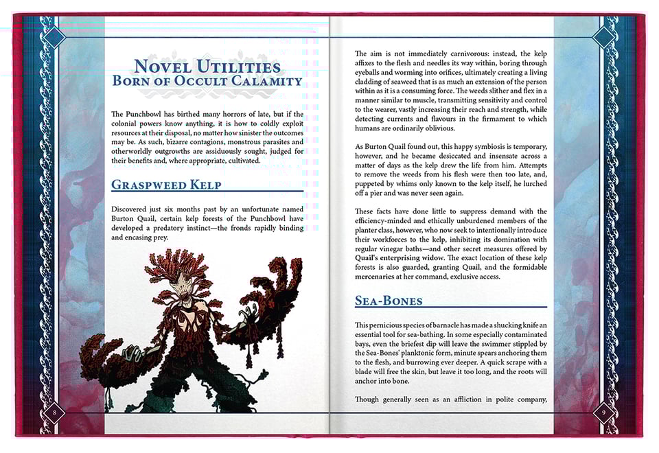 Marsh: The unifying word here is grotesque. There are very real, unutterably horrifying things being done in the name of colonialism at this time. Creating a game in this setting is a challenge: we neither want to exploit those atrocities for entertainment, nor do we want to walk away from them like they never happened, even if we've otherwise created a fictional, magical, mega-lagoon to play in. And I think the comic tradition of the grotesque gives us the tools to reckon with it in an earnestly furious way, while also permitting access to satire, farce and horror as vectors of attack.