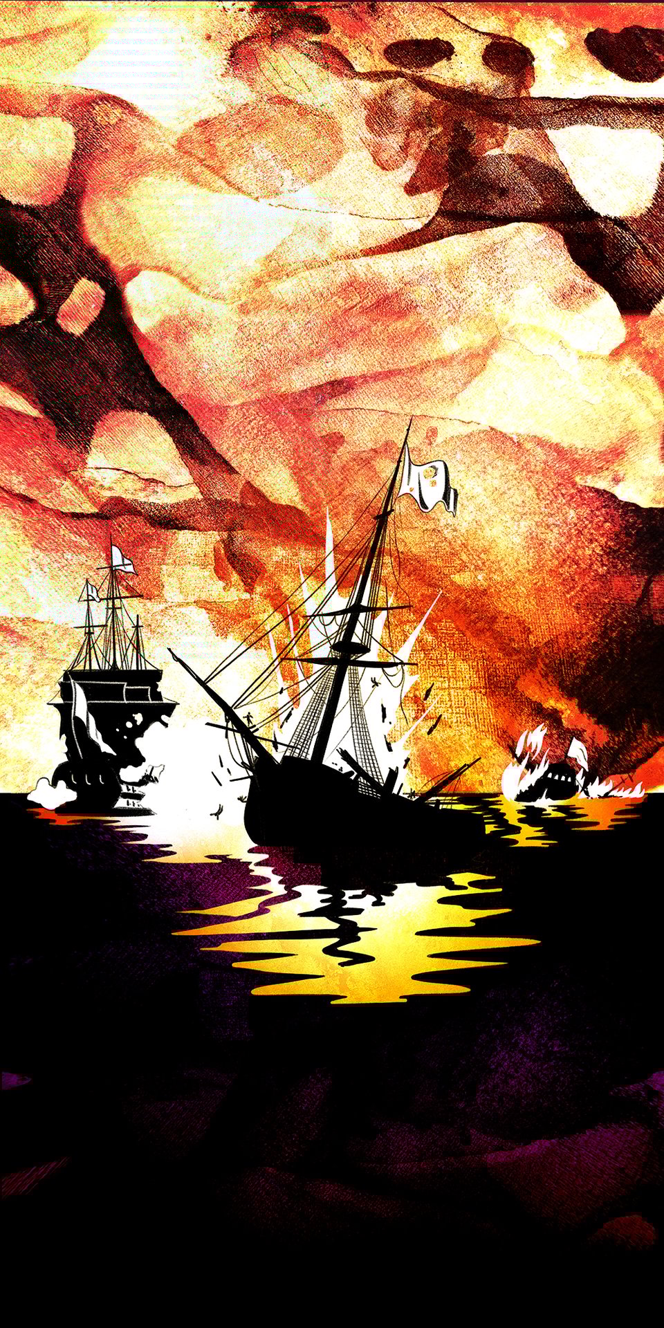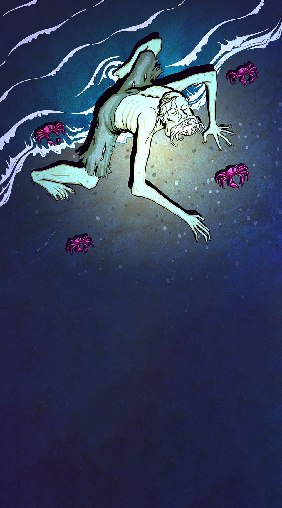 Marsh: Just as well. Anyway, I'd just about given up on the idea colour altogether when I hit upon a combination of textures by accident that unlocked the entire palette in my head. I had been playing with canvas, ink and sand, and I stumbled upon a particular set of filters and colours that gave the impression of blood dissipating through blue-green water, or soaking into sailcloth. And I realised that I could sort of wash all the illustrations I'd done in this palette to give them a sense of cohesion on the page.
