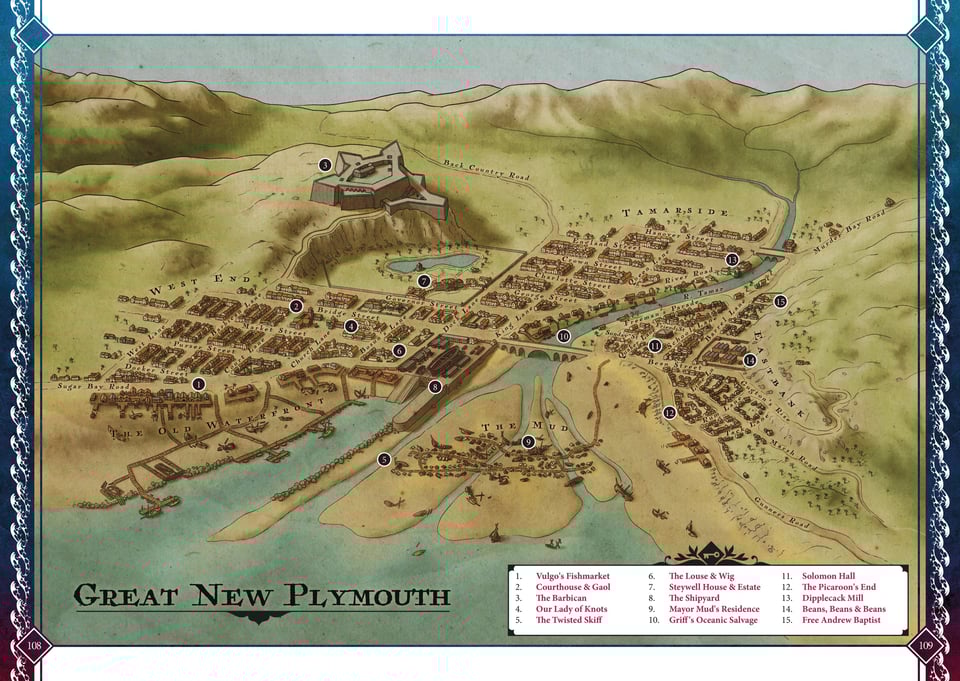 I'm also excited that, with the beta game in backers' hands, we will now be able to release more Gold Teeth material to you as we wend our way towards a final manuscript. For example: this map of Great New Plymouth might be useful.