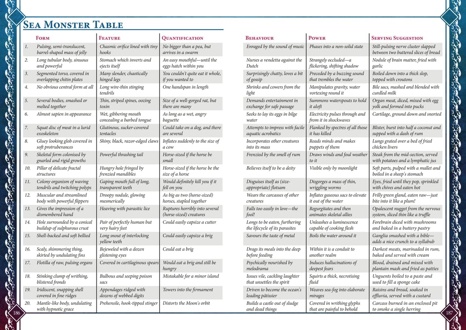 And perhaps this table for generating a sea monster. It even comes with serving suggestions.