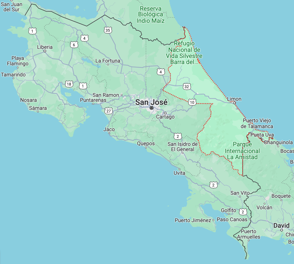 Limón Province covers the entire Caribbean coast, and is named after the largest city and primary port on Costa Rica’s eastern face: Limón. Most of the coastline north of Limón (the city) is sparsely inhabited, with small communities and fishing enclaves, generally connected via waterways versus roads, peppered into nature preserves. To the south of Limón, smaller communities sit interspersed between low-lying agricultural areas, most of them banana plantations.