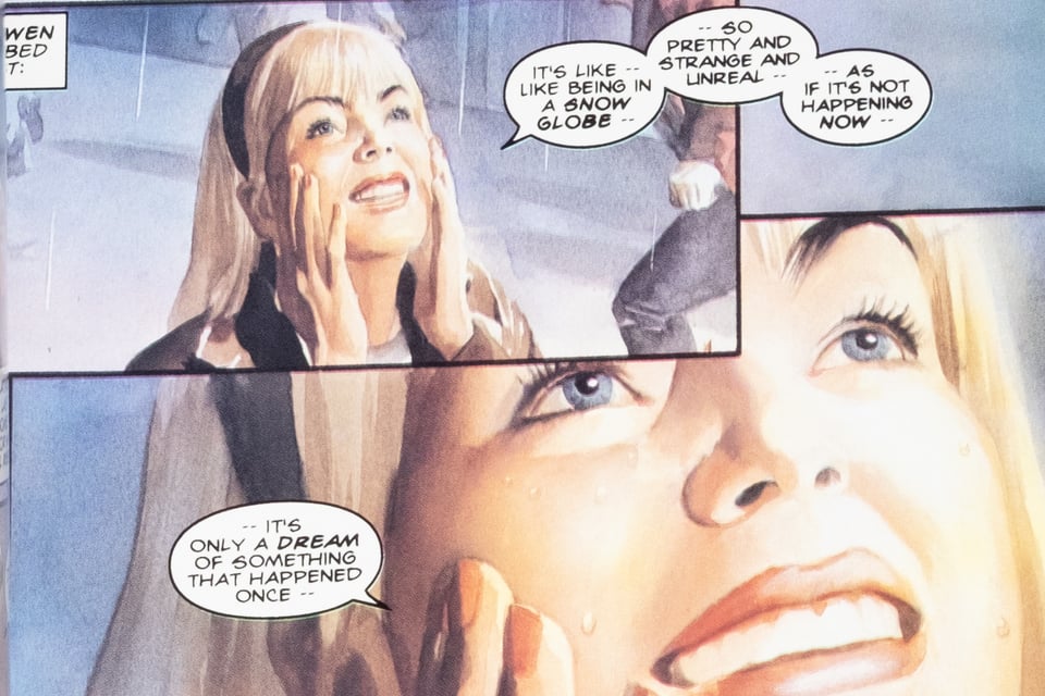 The nostalgia that Busiek channeled in his prose found a perfect counterpart in the Norman Rockwell influenced painted artwork of Ross. There is a misconception among many people that the more realistic an art piece looks, the better it is. This belief explains not only the appeal of Ross, but also other photorealistic artists in general. Not to mention the advent of computer colored rendering instead of inkers, AI “art” and many other popular trends. However, realism ≠ quality. Ross himself has learned this, and I consider myself a fan of his work, if only for the times when he loosens up and shows his hand a little more, like in his recent Fantastic Four graphic novel. His work in Marvels is still young, which makes it some of his best, but at every possible moment the reader is reminded of what he is trying to achieve. Stan Lee’s introduction to the book praises Ross for making the scenes “astonishingly realistic.” At the back of the book are numerous pages devoted to Ross’ process, his use of models, and how he would actually assemble pages. This is all very impressive from a technical perspective, but it comes off as a bit hollow on both sides. Ross’ preoccupation with photo reference and shoehorning in cameos (the FF wedding scene not only has all four Beatles in attendance, but Paul is apparently dead in it) and the almost robotic reception from fandom and media that “this comic is different” simply by virtue of its medium of production. Despite these critiques, the book still gets me whenever I read it! Yes, I am an Alex Ross apologist.