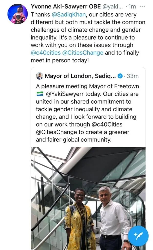 Apart from being on another top 100 list, ‘the top 100 Most Reputable Africans’, Freetown Mayor Aki-Sawyerr, who is also on…the leadership board of the ‘Mayors Migration Council’, met Sadiq Khan in August 2021, and was on Channel 4 discussing the above. Speaking of Sadiq Khan, here HE is with Russia’s richest woman Elena Baturina, the woman who gave Hunter Biden $3.5M…small world ain’t it?