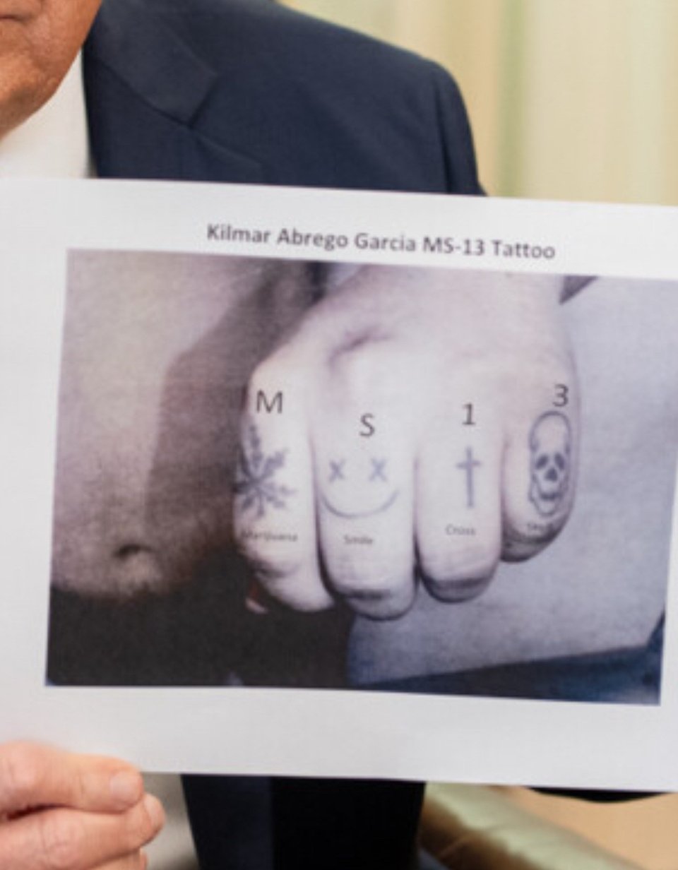 Trump tonight posted that Abrego Garcia has MS-13 tattooed on his knuckles and showed a photo of Abrego Garcia which indeed shows the characters MS 13 across his knuckles - photoshopped onto them.