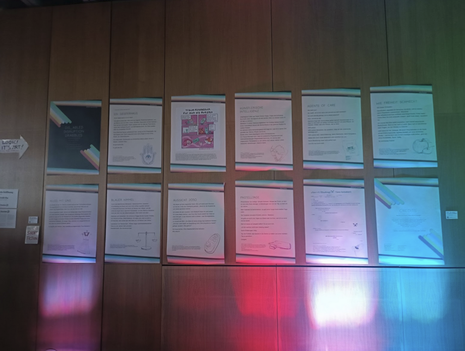Auch die Zusammenarbeit mit der Orga des CCC und das Kennenlernen der anderen Projekte (die findet ihr auch alle auf der Call for Stories-Seite - Novellen, Wimmelbilder, Rollenspiele, PC-Games, schaut mal rein!) war spannend, da ich vorher noch keine Berührungspunkte mit dem CCC hatte. In zwei Videocalls wurden die Projekte vorgestellt und besprochen und die Vernissage auf dem Congress Ende 2024 geplant. Ein wenig lustig-traurig war es natürlich schon, dass ich selbst zu der Veranstaltung - wegen meiner chronischen Krankheiten in Verbindung mit dem sehr laut-bunten Congress und des Fehlens jeglichen Infektionsschutzes - gar nicht hingehen konnte, obwohl sie sogar in Hamburg stattfand. (Wenn es die Option gegeben hätte, nur mal für 1-2 Stunden hinzugehen und das Projekt vor Ort vorzustellen, hätte ich mir das (mit FFP3-Maske) sogar vorstellen können, aber die Möglichkeit gab es offenbar nicht.) Ich war sehr froh, dass sich mit Jamie-Lee Campbell eine der Autor*innen meldete und sagte, sie würde gern hinfahren und das Projekt dort vertreten - danke dafür! Das Ticket konnte dann auch über die Call-for-Stories Orga kostenfrei aufgetan werden. Trotzdem ist es natürlich einfach etwas schade, dass die Plakate am Ende dann an einem Ort hingen, der vielen Beteiligten gar nicht zugänglich war. Aber wer weiß, vielleicht hat es bei den Leuten, die vor Ort die Texte gelesen haben, ja ein paar Überlegungen zu utopischen Orten ausgelöst, die auch Be_hinderung mitdenken.