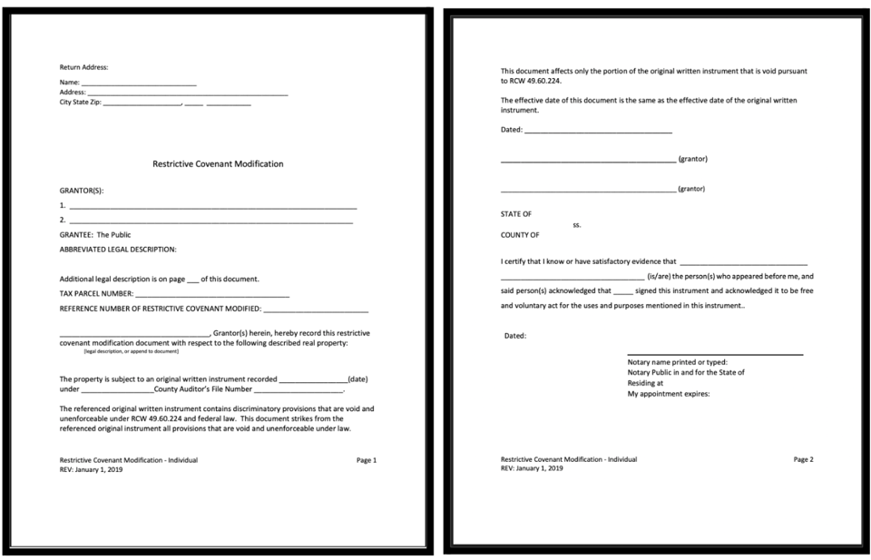 If your property was restricted by a racial covenant, you can modify the restriction using a form from your local county auditor’s office similar to the King County Auditor’s form shown above. It is important to understand that, while modifying a racial covenant is a cursory step in recognizing legacies of local discrimination, addressing the ongoing presence of racial prejudice in our communities requires critical examination of the cultural, legal, and economic institutions perpetuating intergenerational harm to various marginalized groups in Washington State.