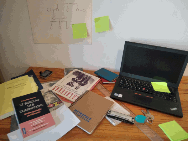 So I came up with another design: instead of a park, the “hub” would be a cluttered desk, Timothée’s desk. The player, playing Timothée, would be able to inspect the items one by one and access memories from them.