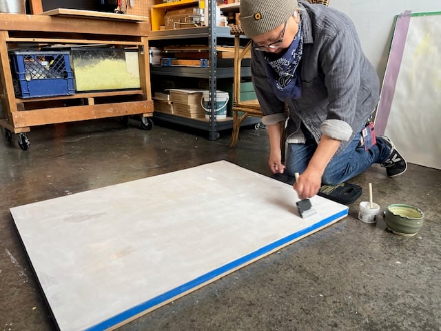 Speaking of blank slates, the above photo is me on my knees painting gesso on a large wooden panel. This gesso is for watercolor and I usually paint several layers, slightly sandpapering in between. This is a regular task I do during my breaks from painting to reset my eyes. I handle the substrate a lot in preparation to create. It’s a necessary step not just technically but mindfully.