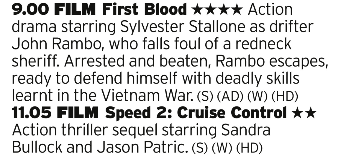 Here’s a double bill and a half for you! In that there’s two films, but one is good and the other isn’t. Can you guess which is which? I mean, the stars give it away but First Blood is the good film out of the two. Well, I say good but it is great and is arguably the best of the franchise. The other films in the series probably aim for a slightly different Manpunching shaped target so it isn’t a straight comparison but there you go. Speed 2 though, that film is just pants