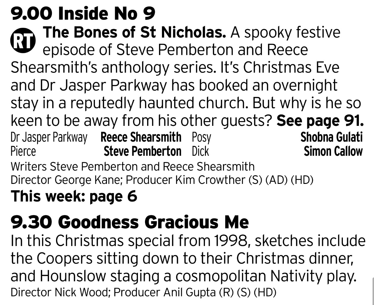 Hand on heart, the live episode of Inside No 9 was one of the best half an hours of TV I’ve ever seen so whilst this isn’t a live episode (or is it? No, its not but you know) it should still be a Christmas treat. Then yet another Christmas special from the archives, this time of the sketch show variety. Might be a bit hit or miss? Possibly, but when it hit Gracious Me was always really funny.