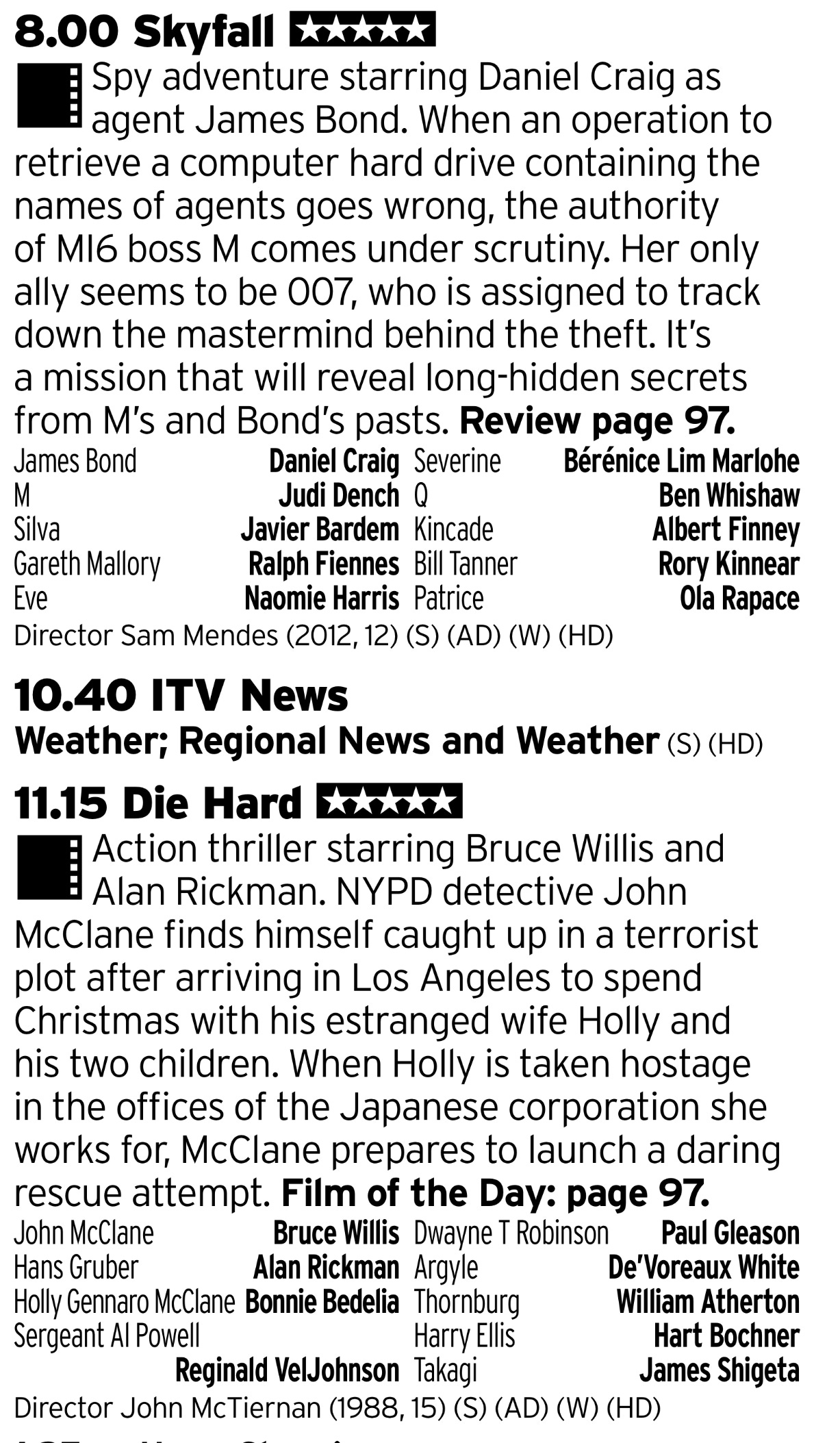 Skyfall is a bit of a Christmas film for me; not because of any Christmas themes in the film, I mean there aren’t any at all. But for a while it always seemed to be on in the background on Christmas Eve as we were sorting out Christmas stuff. So thats good, and then its followed by The Definitive Christmas Film No I Will Not Be Taking Any More Questions At This Time.