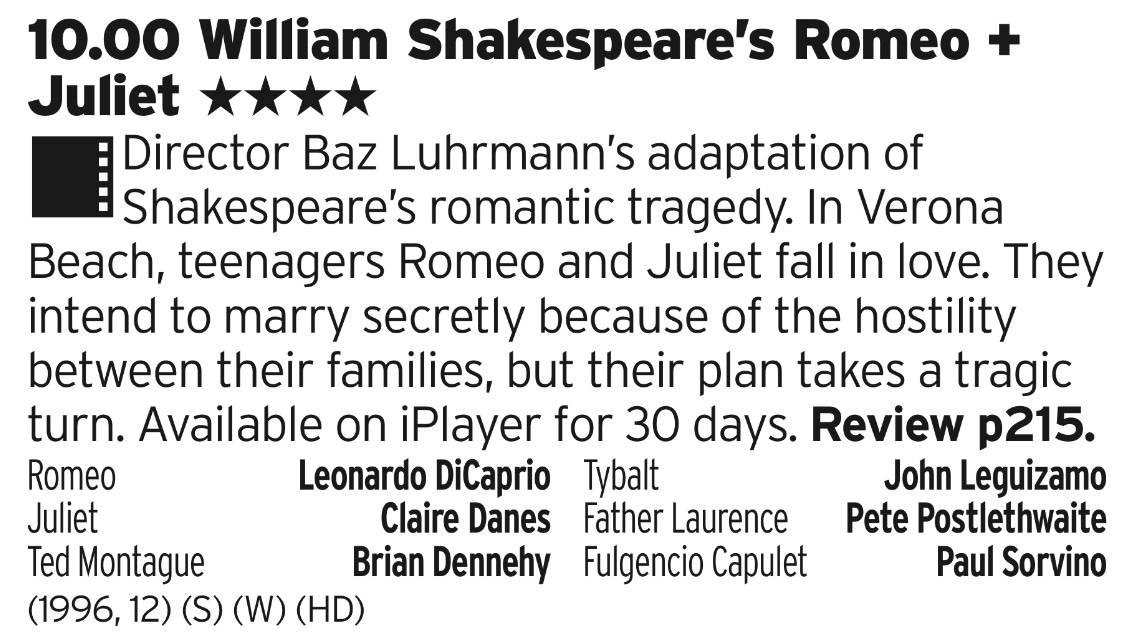 As adaptions of Shakespeare go there are several ways to go; stick to the original text (Hamlet from 1996), move it to the modern era (Richard III from 1995) or keep the bones of it but change everything else (10 Things I Hate About You). This film does the first two at the same time, keeping the iambic pentameter dialogue but placing it in a modern setting. It shouldn’t work, but it really does