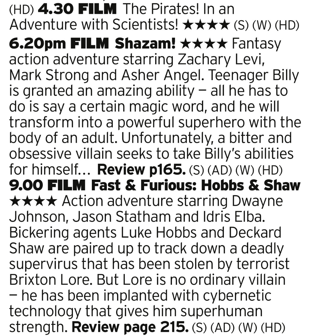 I think we had Shazam on a previous day, but we’re including it again here as it acts as a nice filling in a big dumb fun sandwich. The Pirates! is arguably the best of the Aardman Animation feature films, and Hobbs & Shaw is the absolute dictionary definition of big dumb fun action films. Its so big and dumb it makes the Fast and Furious films look positively high brow